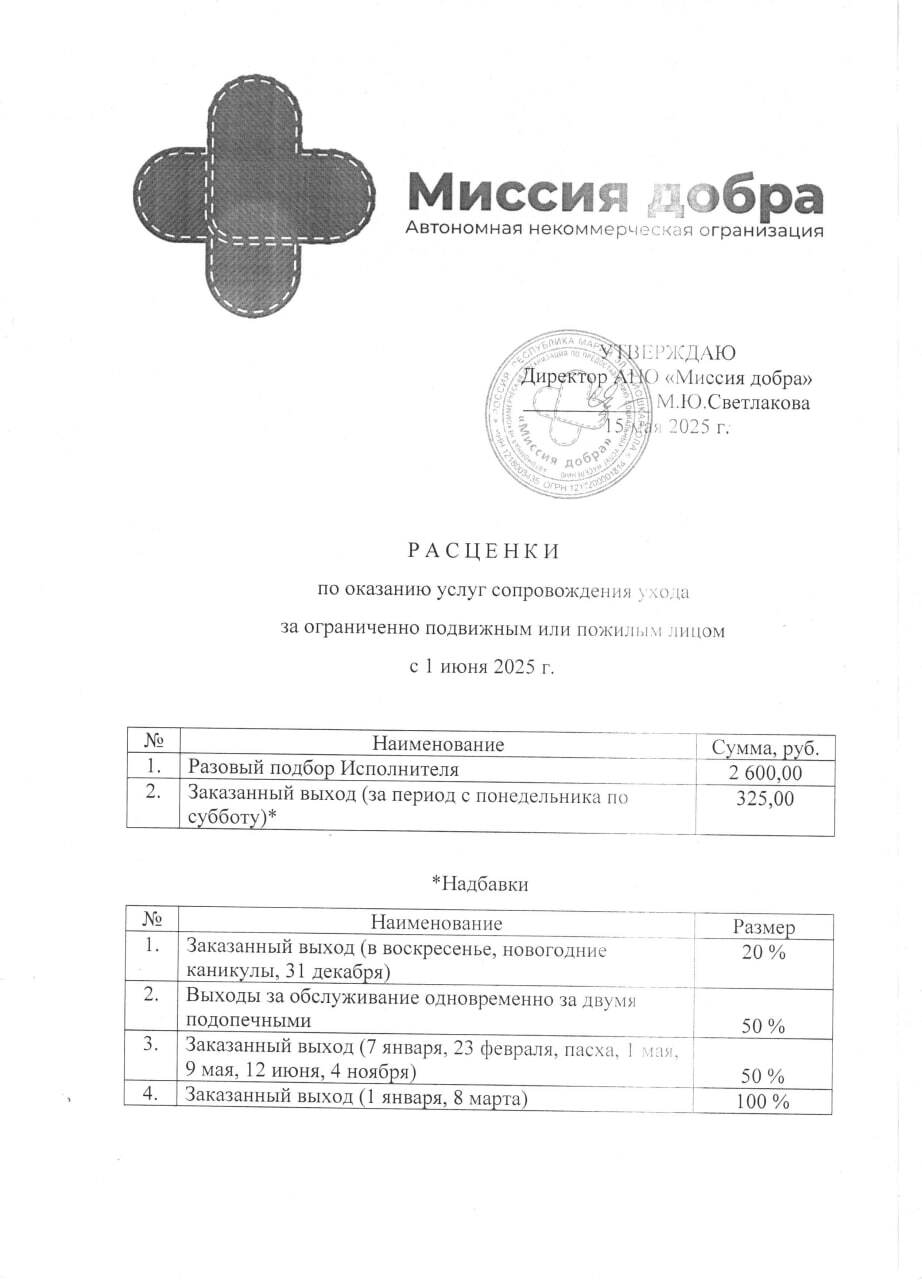 Автономная некоммерческая организация по предоставлению социальных услуг населению «Миссия добра» создана в целях оказания социальных услуг гражданам, в том числе признанным нуждающимися в социальном обслуживании на дому, из числа лиц пожилого возраста и инвалидов (в том числе детей-инвалидов), направленных на улучшение условий их жизнедеятельности при сохранении пребывания гражданина в привычной благоприятной среде – месте их проживания.